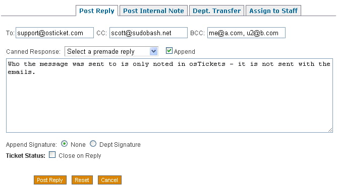 I’m setting up another install of osTickets for another department (that needs a whole other server). In the process it was requested that they be able to change who the response address is incase they need to send it along to someone else or in order to include multiple addresses. The following is a simple MOD I came up with that seems to work as desired. As always please let me know if you have any questions or notice any problems.