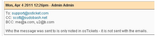 <table> <tr> <td>To:</td><td><input size=80 type="text" name="send_to" value="<?=$ticket->getEmail()?>"></td> </tr> <tr> <td>CC:</td><td><input size=80 type="text" name="cc_to" ></td> </tr> <tr> <td>BCC:</td><td><input size=80 type="text" name="bcc_to" ></td> </tr> </table>
